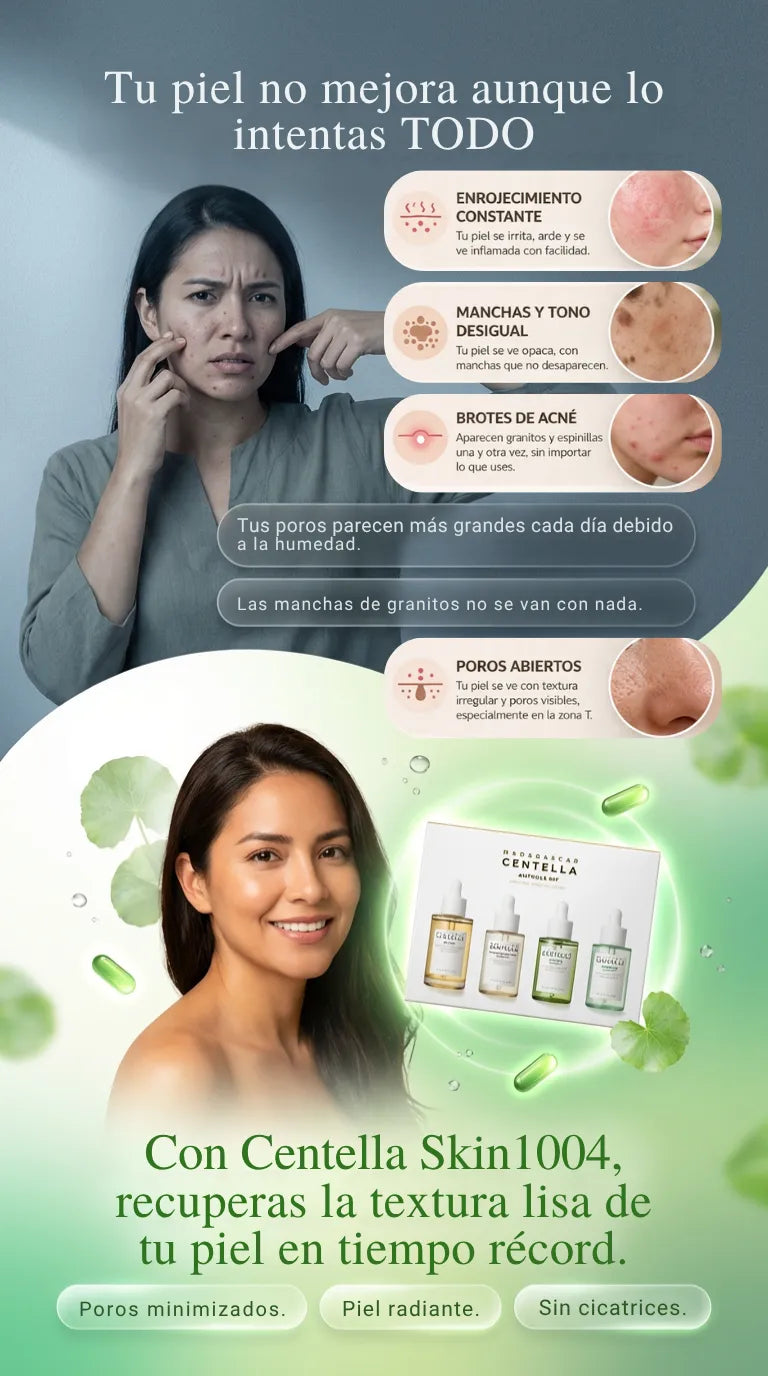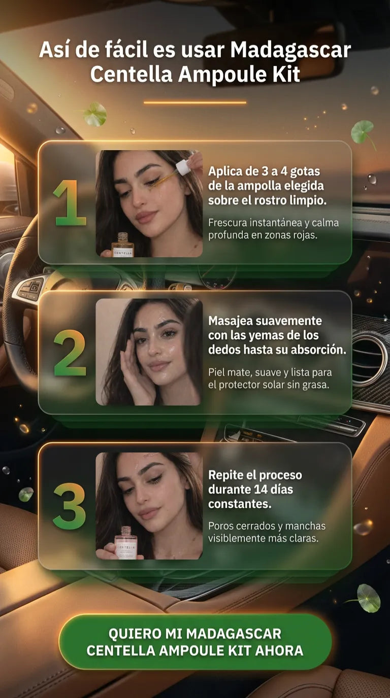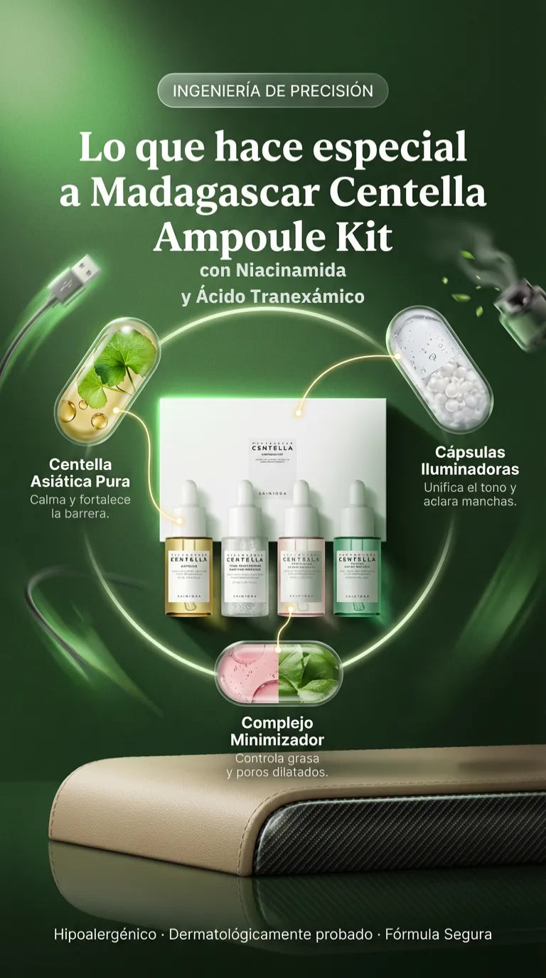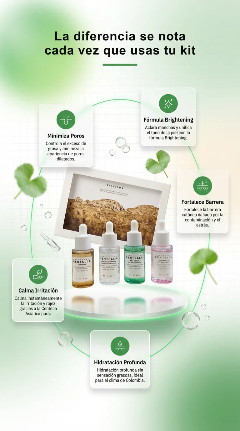 Sí, este kit contiene Centella Asiática de Madagascar, un ingrediente reconocido por sus propiedades calmantes, ideal para personas que buscan una rutina suave y reparadora.