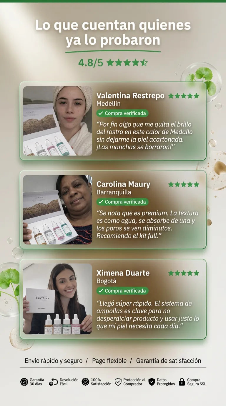 Puedes elegir la ampolla según la necesidad de tu piel en ese momento. El kit incluye opciones para calmar, mejorar el tono, ayudar con poros visibles y complementar rutinas para piel con imperfecciones.